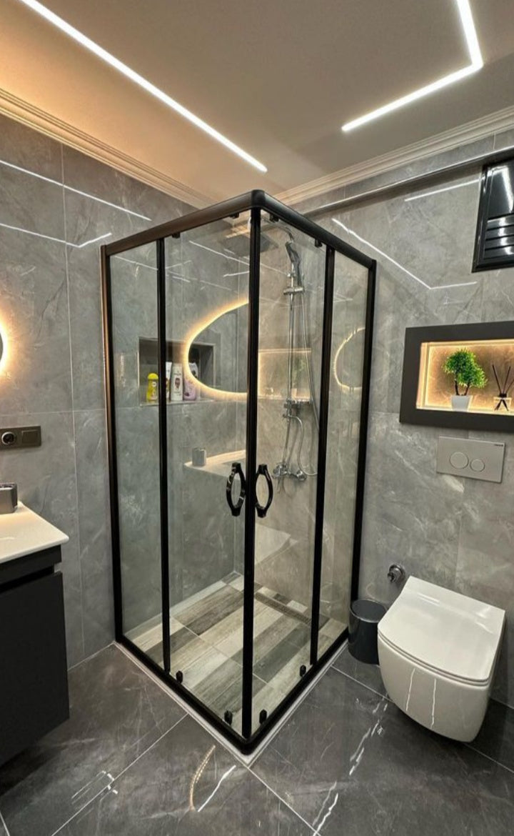 Elevate your bathroom with our bespoke glass cabin designs. This featured installation highlights our ability to combine minimalist matte black framing with high-clarity tempered glass to create a stunning focal point. From seamless corner units to integrated lighted mirrors, we provide end-to-end interior design solutions that turn standard washrooms into spa-like retreats